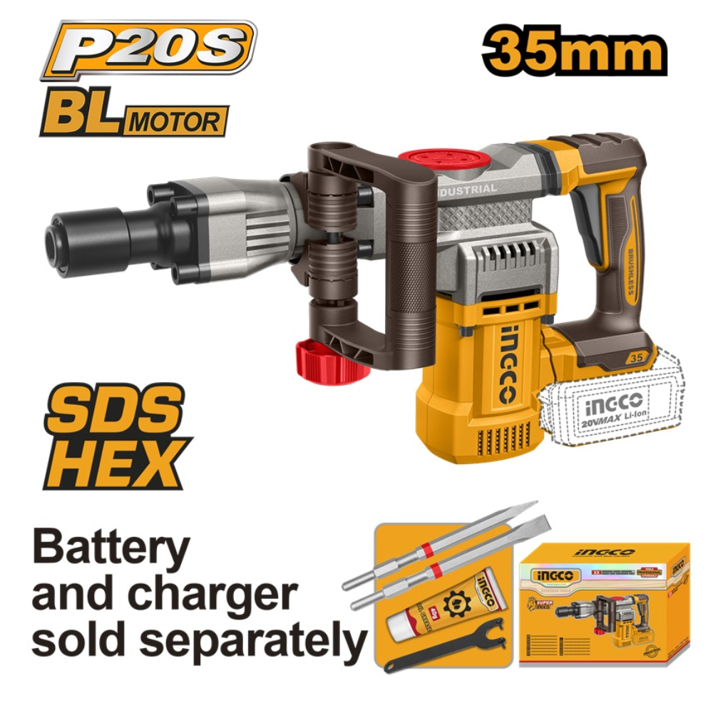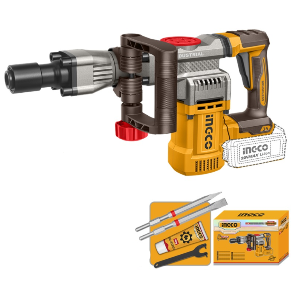 Аккумуляторный отбойный молоток INGCO CDBLI20358 — это мощный и удобный инструмент для демонтажных и долбёжных работ в условиях, где важны мобильность и независимость от электросети. Он отлично подходит для разрушения бетона, кирпичной кладки, камня и других твёрдых материалов.