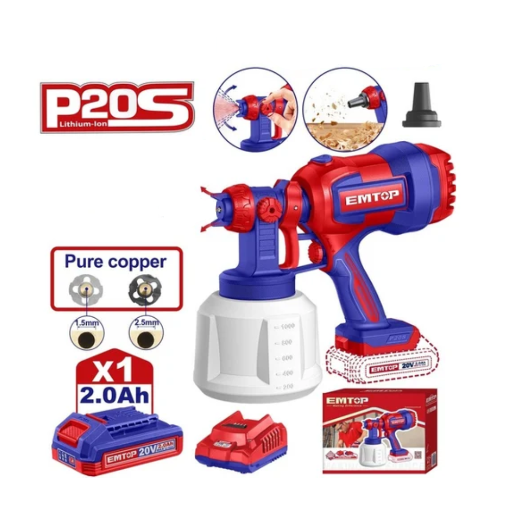 Аккумуляторный краскопульт EMTOP ELSG20042 — это инструмент, который превращает процесс покраски из утомительного и «грязного» занятия в продуманный, аккуратный и почти творческий процесс. Он словно даёт вам кисть с равномерной, мягкой подачей краски, позволяя работать быстро и без лишнего напряжения.