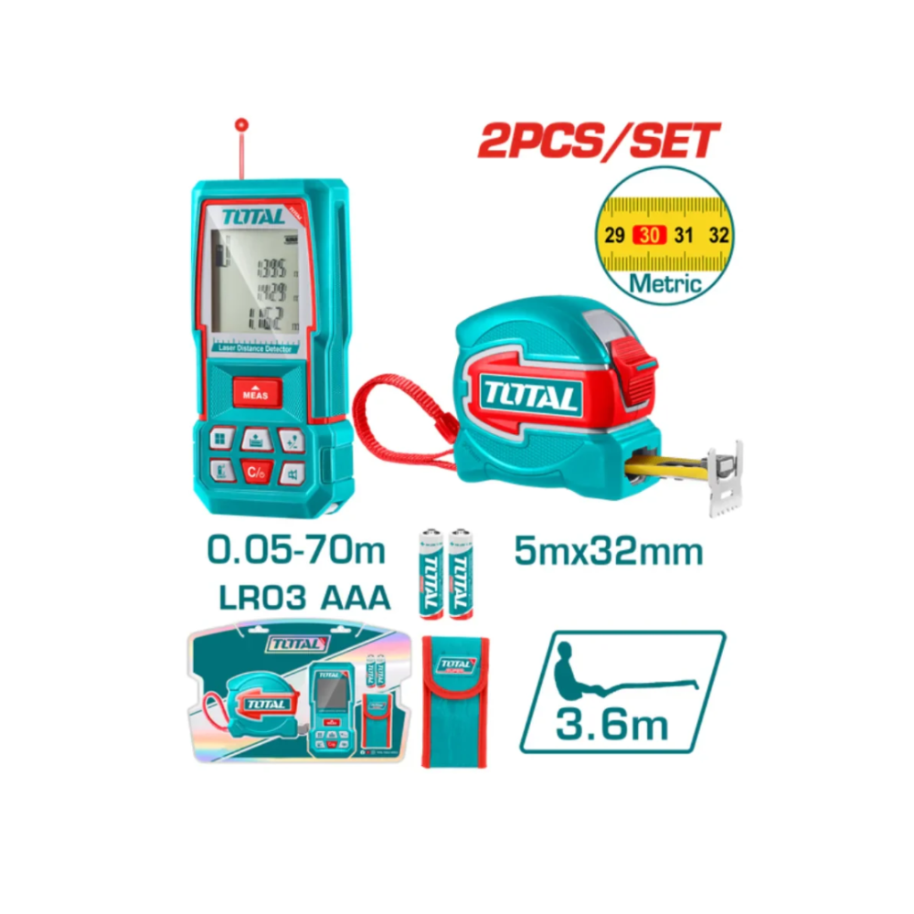 Благодаря лазерной технологии измерения прибор работает быстро и точно, сокращая время работы по сравнению с рулеткой. TOTAL TLDD241201M отличается надежностью, простотой управления и подходит для использования внутри помещений и на строительных площадках.