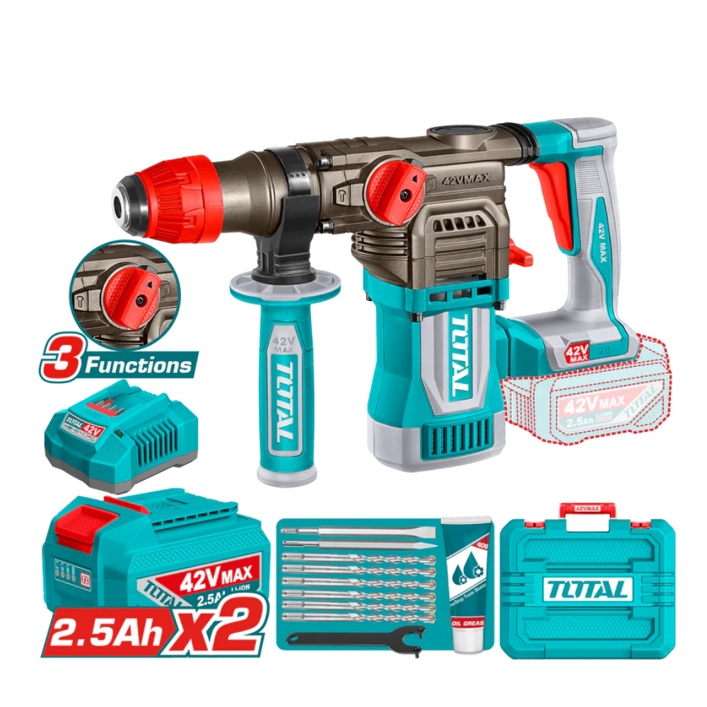 Аккумуляторный перфоратор TOTAL TRHLI422882 — мощный и универсальный инструмент для сверления и долбления в бетоне, кирпиче, камне и других твердых материалах. Отлично подходит для строительных, монтажных и ремонтных работ как на профессиональных объектах, так и в бытовом использовании.