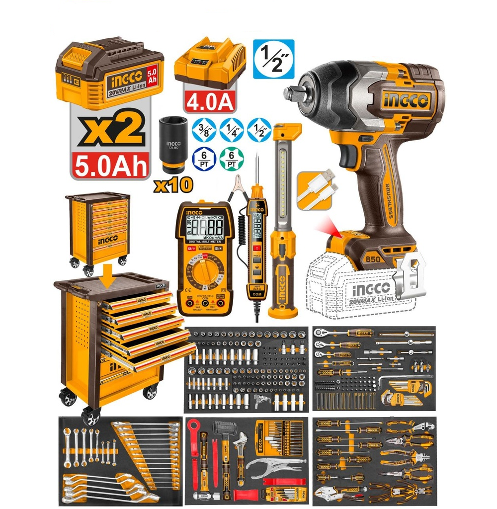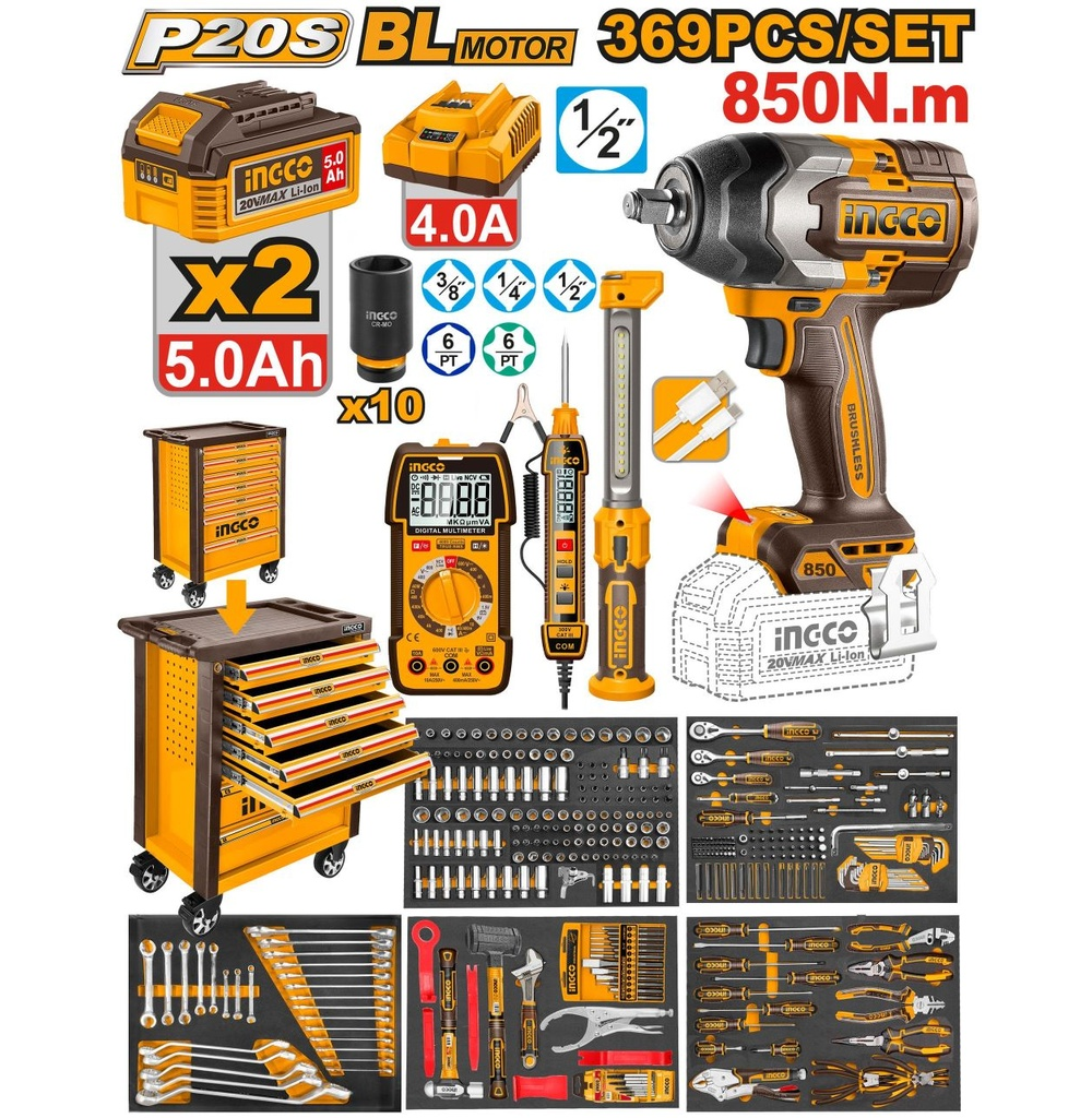 INGCO HTCS283692 — это ультимативное решение для профессиональных автомастерских, сервисных центров и промышленных предприятий. Набор включает в себя мощный бесщеточный гайковерт серии P20S, вспомогательное измерительное оборудование и колоссальный ассортимент ручного инструмента, аккуратно организованного в мобильной инструментальной тележке.